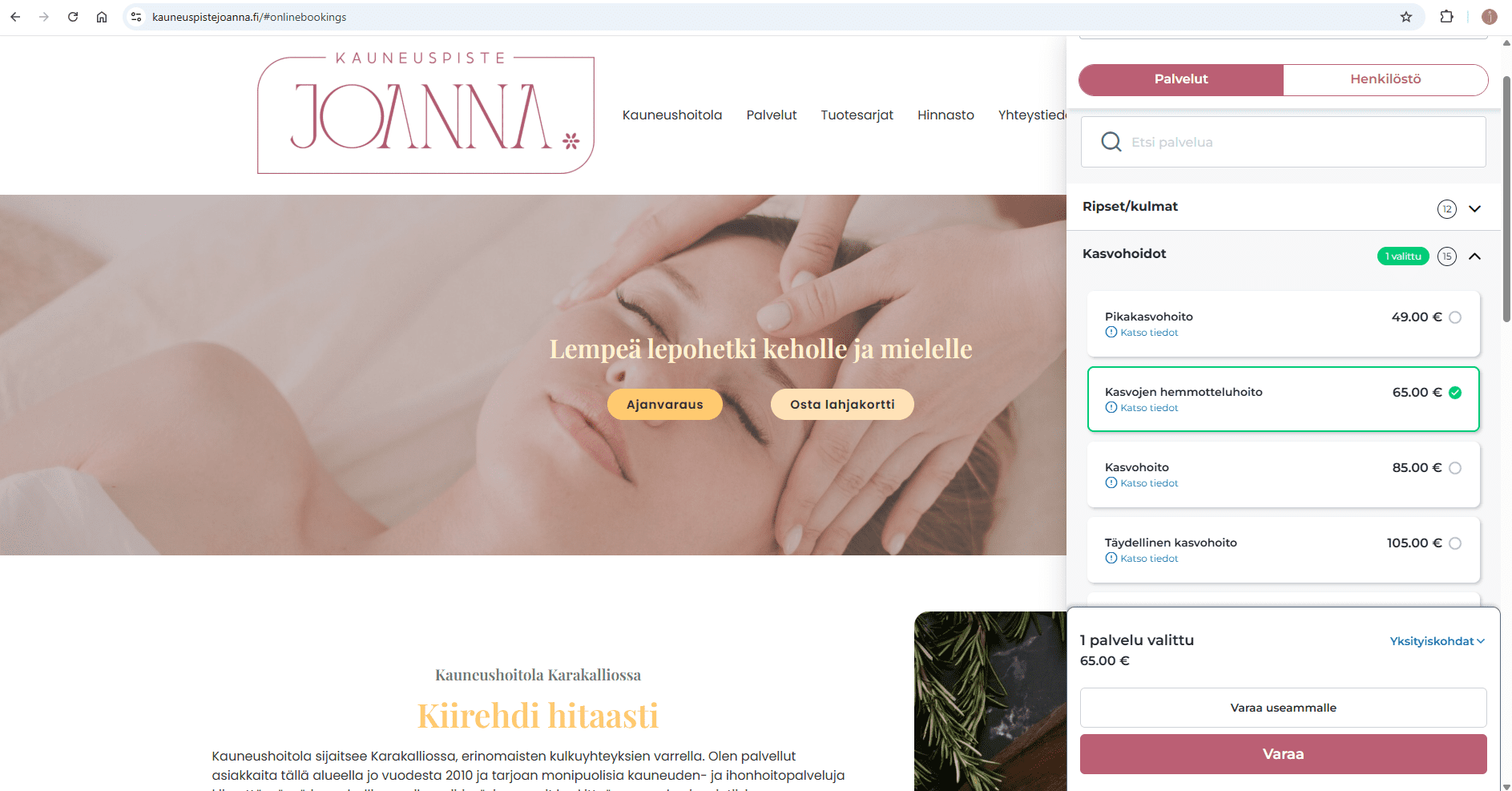 Valitse palvelu-/ tai palvelut joita haluat varata. Ensin tulee valita kategoria. Jos haluat varata esimerkiksi aikaa kasvohoitoon valitse ”Kasvohoidot”. Tämän jälkeen valitse palvelu minkä haluat varata – voit varata samaan hoitokertaan myös lisäpalveluita tai voit varata samaan kertaan myös toisen palvelun erikategoriasta.
