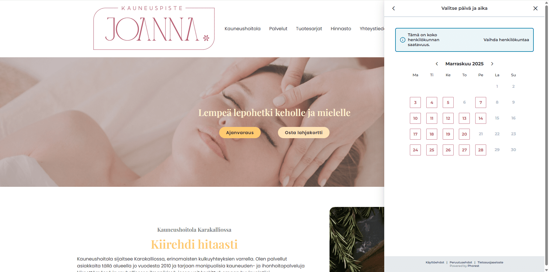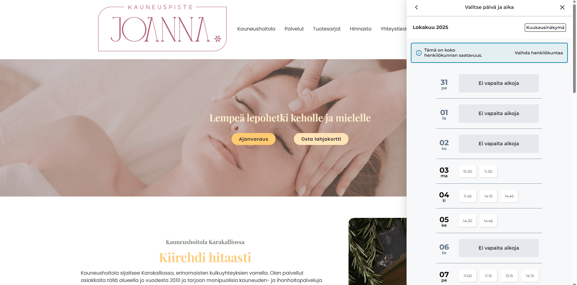 Vaihtaaksesi kuukautta valitse oikeasta yläkulmasta ”kuukausinäkymä” ja pääset vaihtamaan kuukautta, näet samalla kuukausi näkymässä kaikki ne vapaat päivät joista vapaata löytyy. Valitse sinulle sopiva päivä ja tämän jälkeen näet kyseisen päin vapaat kellon ajat joista pääset valitsemaan itselle sopivinta.