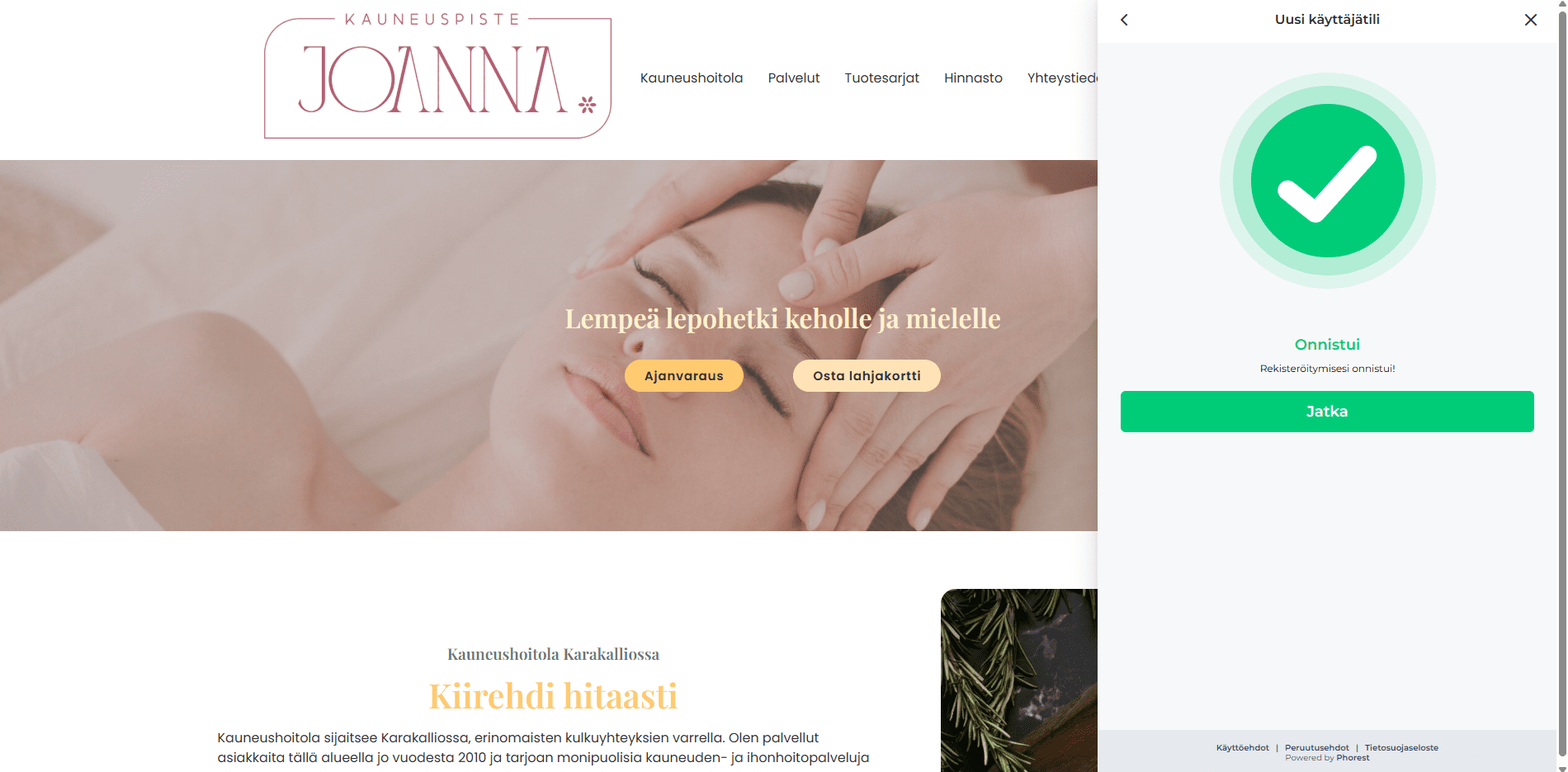 Näet vielä ennen varauksen vahvistusta päivän, kellon ajan sekä hoidon mitä olet varaamassa. Kun haluat vahvistaa ajan paina ”vahvista varaus”. Huomaathan että varauksen vahvistukseen aikaa 5 minuuttia jonka aikana, varaus tulee vahvistaa. Ilman ”vahvista varaus” aika ei talennu.